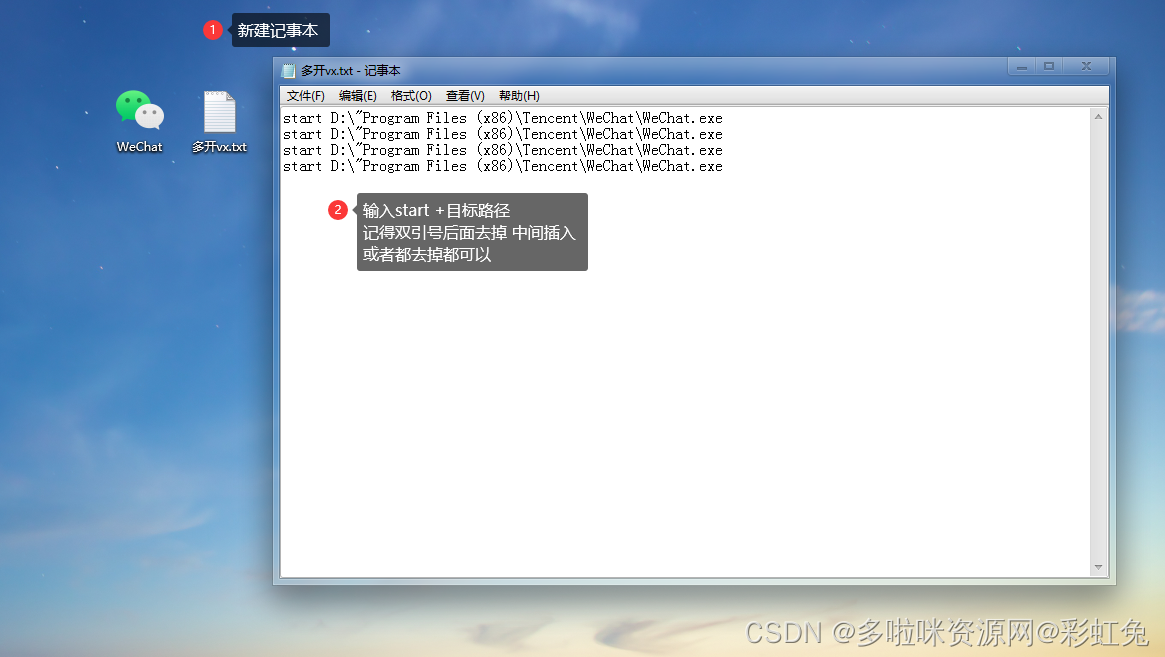 新建记事本输入:start D:\"Program Files (x86)\Tencent\WeChat\WeChat.exe