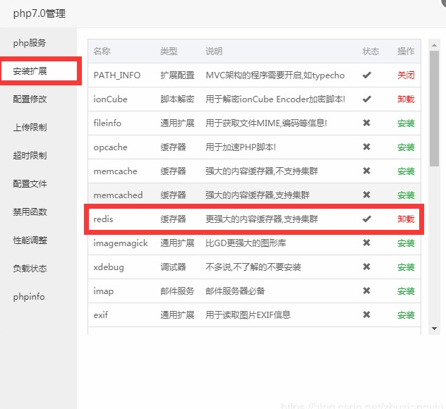 3、选择“安装扩展”菜单,选择对应的扩展 redis 进行安装: